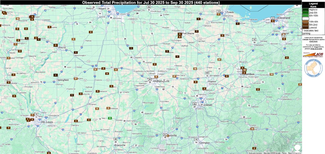 The rapid onset of drought began in August. Using the Southern Regional Climate Center’s Climate Perspectives Tool, available for the Midwestern Region, I aimed to compare the total precipitation for August to September with historical data (Figure 2). Several stations in northern Indiana experienced their top 5 driest August to September on record. Marion, Indiana, recorded 2.19 inches over the two months, which was 5.26 inches below the 1991-2020 climatological normal. This was the driest August to September period Marion ever experienced, with records spanning more than 131 years of data. The Fort Wayne Airport had its fourth driest August to September on record, spanning 121 years of data. Drought impacts range from dormant lawns (a welcome break from mowing, though) to the lowest water levels some have seen in ponds, reduced streamflows, rapidly drying crops, premature tree leaf drop, and various other effects.
