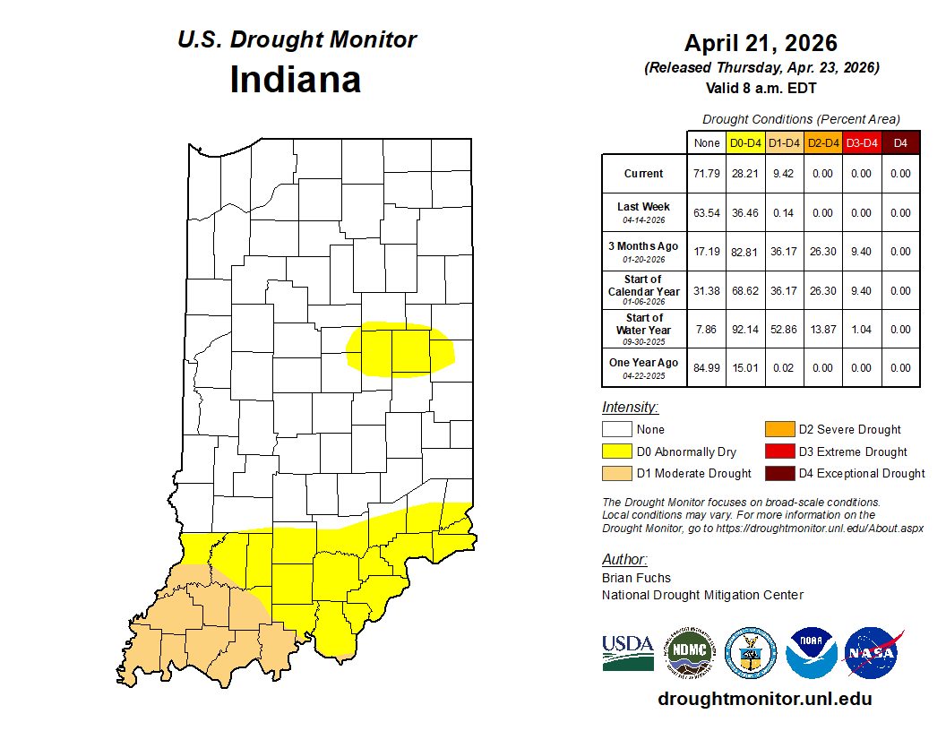 For at least 100 straight weeks (since mid-July 2024!) counties in north-central Indiana (from about Newton and Benton counties in the west to Allen, Adams, and Jay counties in the east) have been in some level of dryness. While not all these counties have been impacted, at least some of them have been anywhere from Abnormally Dry (D0) to Extreme Drought (D3) according to the U.S. Drought Monitor every week. At that most dry-free point in July 2024, there was some abnormal dryness in parts of Jay and Randolph counties (eastern Indiana) as well as some dry areas in the Vermillion-Parke-Vigo county region (western Indiana) and southeast eastern counties spanning from Dearborn into Jackson counties. This drought “minimum” lasted about a month and then conditions started drying out again and hasn’t stopped until this week. That is quite a long time! Because of the recent spring rains, we are once again “almost” dry-free in this area. Only the Madison-Henry county area is labeled as Abnormally Dry in that region (Figure 1). Unfortunately, southwestern Indiana is starting to worsen with some Moderate Drought conditions developing. When was our entire state devoid of any US Drought Monitor category? Answer: April 23, 2024, through June 11, 2024. Yeesh! Will Indiana see a return to that status again this spring? Of course, just because the state is without drought or abnormal dryness doesn’t mean things are great. This could be because conditions have swung too much to the wetter side! This has historically led to delayed planting, plant disease, or other negative impacts. Let us hope for more ideal conditions and fewer extremes!