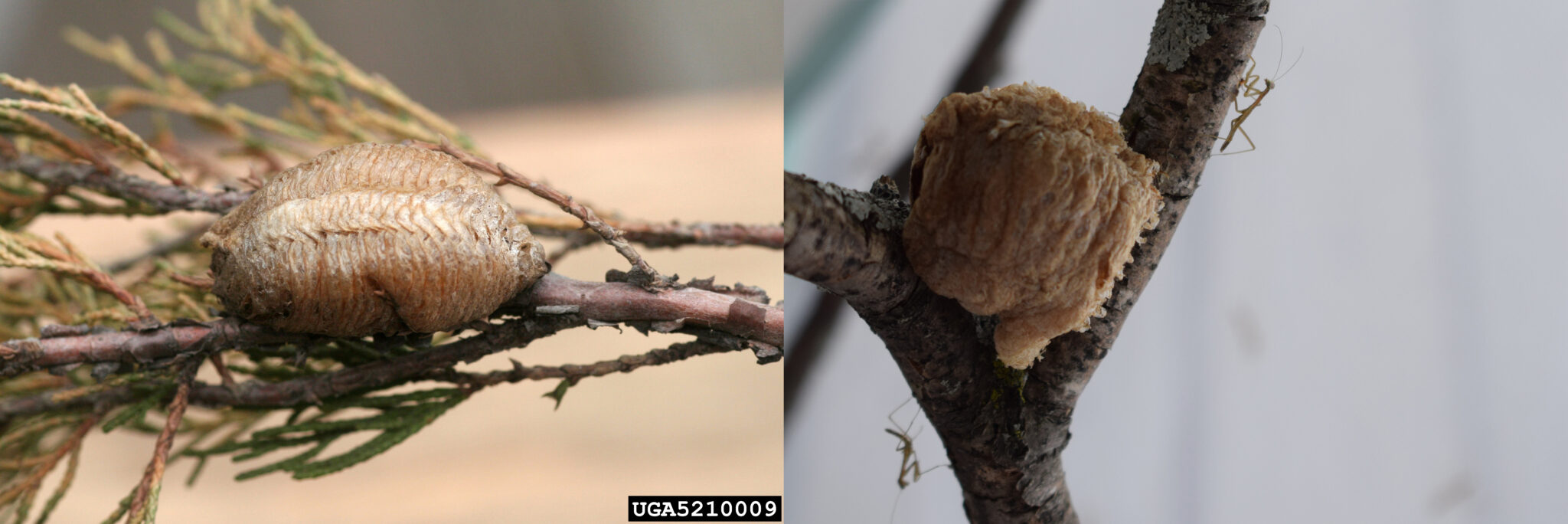 - Image 1: Mantis eggs can be oblong or round like a ping pong ball. Regardless of their shape, they are pale brown and have a Styrofoam texture. Newly hatched mantises look like a more delicate version of their adult form. Photo credits: Whitney Cranshaw; Elizabeth Barnes, Purdue University.
