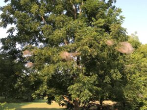 Fall webworm attacks a wide range of deciduous trees including flowering fruit trees, black walnuts, elm, hickory and bald cypress. They are most common in suburban areas, roadsides and forest edges that lack the predators and parasites the webworms encounter in the forest. In June adults emerge from wintering sites to lay eggs in the canopy. Eggs hatch into caterpillars that encase branches in webs as they feed. By the end of the second generation in late August webs can cover substantial portions of trees. Caterpillars are yellowish-green with black spots and long white hairs, and grow up to 1.5″. Caterpillar feces falling from trees can be a problem during heavy infestations.